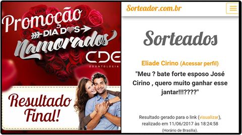 Saiu o resultado final do sorteio do Dia dos Namorados da CDE Odontologia! Eliade Cirino e o maridão José Cirino são os sortudos que vão curtir um jantar romântico no Piquiras!